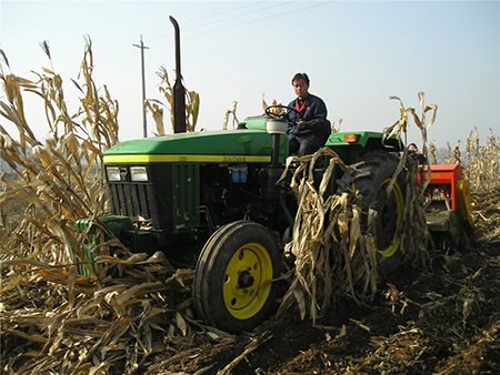 該機(jī)可以再也米稈直立地、秸稈還田地、小麥高茬浮稈地、深翻地等不同前茬條件下,一次性完成滅茬稈、開溝、播種、施肥、覆土、鎮(zhèn)壓等多道工藝。配置指甲式的玉米精量排種器與勺式的相比在同一質(zhì)量下由每小時(shí)前進(jìn)5km提高到8km。底盤采用變速旋耕機(jī),可根據(jù)拖拉機(jī)不通的前進(jìn)速度和當(dāng)?shù)氐霓r(nóng)藝要求、土質(zhì)差別,靈活變換三種刀軸轉(zhuǎn)速,徹底解決了拖拉機(jī)跑的快效果差,跑的慢了效益差的問題。