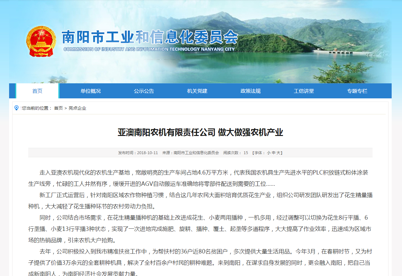去年,公司積極投入到我市精準(zhǔn)扶貧工作中,為幫扶村的36戶近80名貧困戶,多次提供大量生活用品。今年3月,在春耕時節(jié),又為村子提供了價值3萬余元的全套耕種機具,解決了全村百余戶村民的耕種難題。來到南陽,在謀求自身發(fā)展的同時,更會融入南陽,把自己當(dāng)成新南陽人,為南陽經(jīng)濟社會發(fā)展貢獻力量。