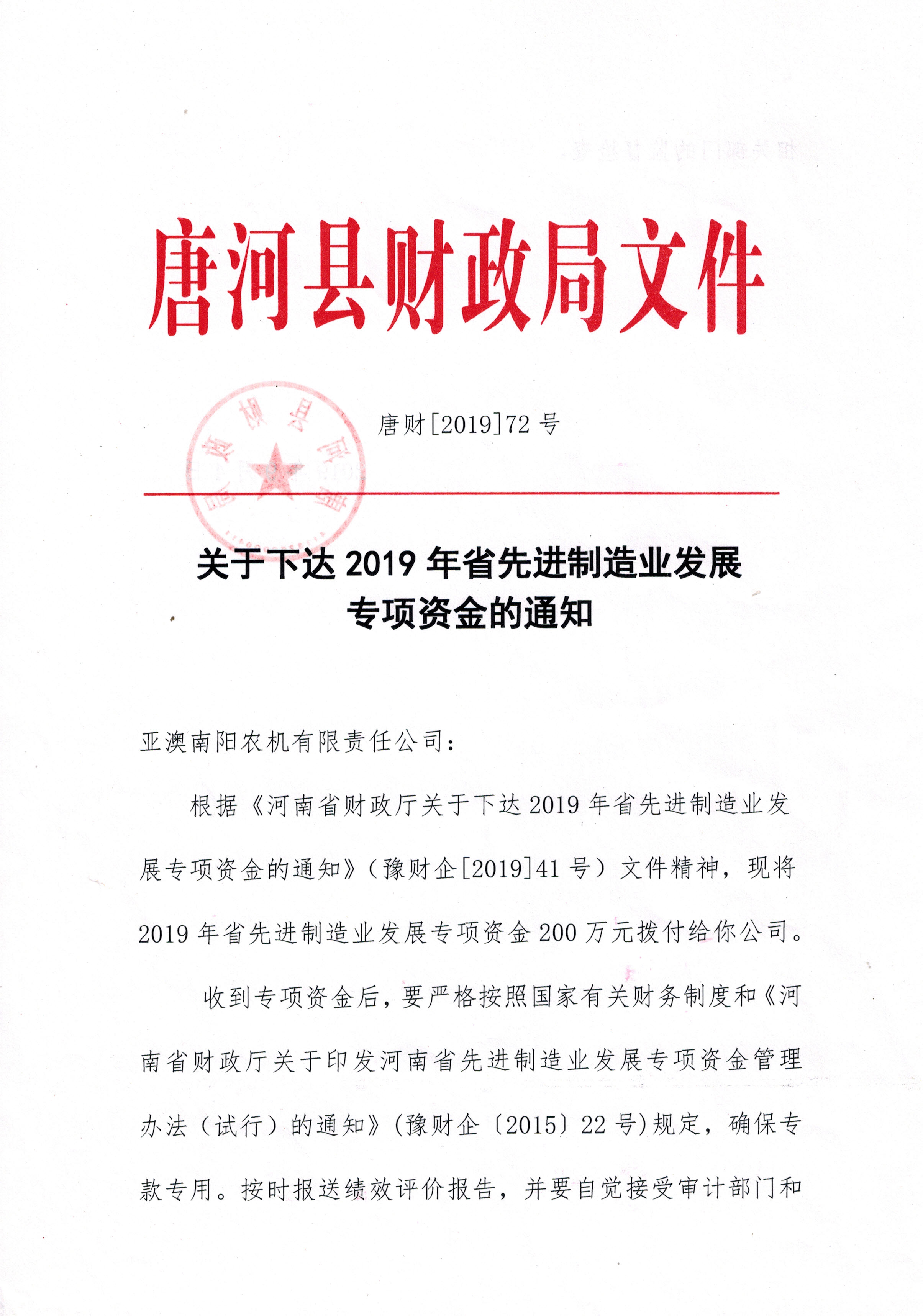 近日,國(guó)家工信部下達(dá),河南省政府《印發(fā)<關(guān)于下達(dá)2019年省先進(jìn)制造業(yè)發(fā)展專項(xiàng)獎(jiǎng)金的通知》,對(duì)獲得先進(jìn)制造業(yè)--國(guó)家綠色工廠的南陽(yáng)市唐河縣亞澳南陽(yáng)農(nóng)機(jī)有限責(zé)任公司的扶持專項(xiàng)資金200萬(wàn)元下?lián)堋?/span>