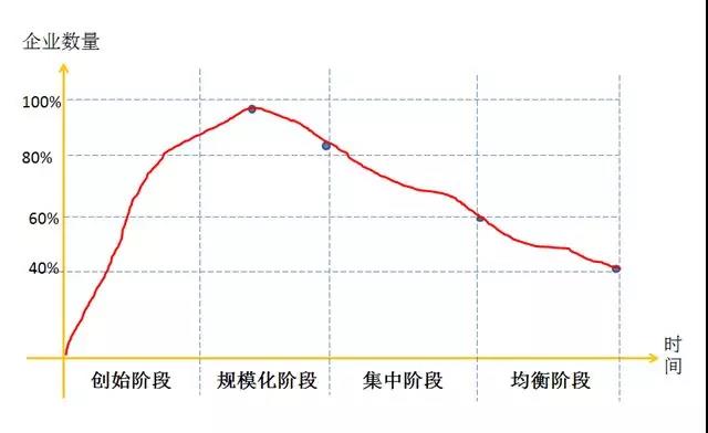 在一個(gè)行業(yè),從長(zhǎng)期看,企業(yè)要存活下來(lái)就要有超出平均水平的成本控制能力。管理學(xué)家陳春花認(rèn)為一個(gè)行業(yè)內(nèi)企業(yè)數(shù)量和時(shí)間軸之間的關(guān)系可以通過四個(gè)發(fā)展階段來(lái)說(shuō)明:初創(chuàng)階段、規(guī)?;A段企業(yè)數(shù)量一直上升,規(guī)模化后期企業(yè)數(shù)量達(dá)到頂峰,開始有擠出效應(yīng),約20%企業(yè)出局,到集中階段又有20%企業(yè)出局,到均衡階段還要淘汰20%,最后的競(jìng)爭(zhēng)就在剩下的40%企業(yè)之間展開。
