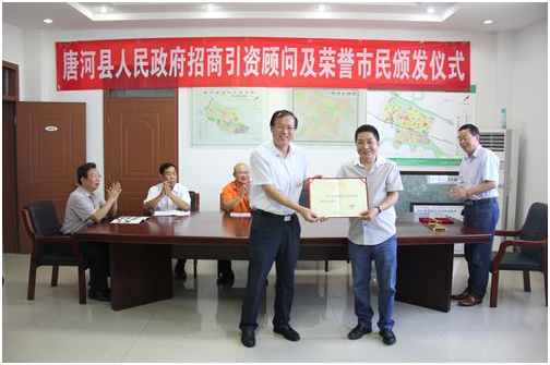 9月1日,唐河縣人民政府舉行招商引資顧問(wèn)及榮譽(yù)市民頒發(fā)儀式??h長(zhǎng)周天龍、政府副縣長(zhǎng)王天清、縣產(chǎn)業(yè)集聚區(qū)黨工委書(shū)記王全廣等出席儀式。