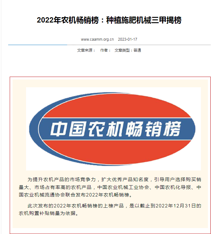 據(jù)中國(guó)農(nóng)機(jī)網(wǎng)最新消息,為提升農(nóng)機(jī)產(chǎn)品的市場(chǎng)競(jìng)爭(zhēng)力,擴(kuò)大優(yōu)秀產(chǎn)品知名度,引導(dǎo)用戶(hù)選擇購(gòu)買(mǎi)銷(xiāo)量大、市場(chǎng)占有率高的農(nóng)機(jī)產(chǎn)品,中國(guó)農(nóng)業(yè)機(jī)械工業(yè)協(xié)會(huì)、中國(guó)農(nóng)機(jī)化導(dǎo)報(bào)、中國(guó)農(nóng)業(yè)機(jī)械流通協(xié)會(huì)聯(lián)合發(fā)布2022年農(nóng)機(jī)暢銷(xiāo)榜。亞澳農(nóng)機(jī)進(jìn)入耕整地機(jī)械和種植施肥機(jī)械農(nóng)機(jī)暢銷(xiāo)雙料三甲榜。